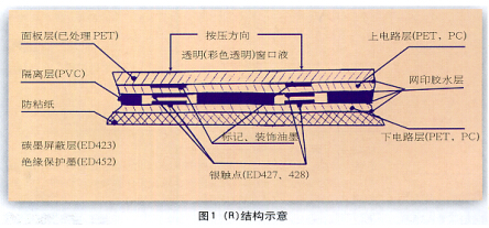 (R) 結(jié)構(gòu)薄膜開關(guān)是由面板層 隔離層 電路層組成 它們選用了PET,PC,PVC等各種不同性質(zhì)的軟性薄膜 就是在這些片材上通過網(wǎng)版印刷在面板上印刷彩色指示性油墨 在電路層上印刷導(dǎo)電線路和絕緣油墨等 再進(jìn)行組合就成了薄膜開關(guān).